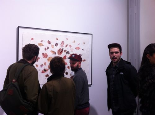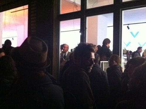 parkplatz direkt davor, schlange vorm einlass, an dem ein mann in einem papierstapel blättert und namen durchstreicht. ich bin über freunde da und hab keine einladung, wieso überhaupt eine vernissage mit einladung? kenn ich sonst nur von museen, nicht von orten mit verkaufsabsicht. ich nutze in alter, noch nicht verlernter technik die sekunde, als der einlasser kurz woandershin guckt und gehe durch. drinnen sehr, sehr voll, die in-crowd komplett da, sehr gut angezogen, ich bin erleichtert, das die schuhe von heike makatsch so aussehen wie meine, hätte aber einen abendmantel und komplette schminkatur wählen sollen, statt der uralten d&g- herbstjacke, aber wer ahnt denn so einen auflauf?