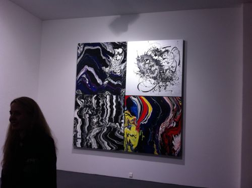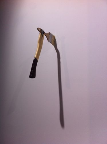 paar sehr schöne objekte, einen plätschernden brunnenturm aus mülltonnenfragmenten, eine zerschnittene tür mit einem sehr eleganten dicken pinselhieb darüber (von clemens behr), diese axt unten, schöne klare ideen. die großformatigen bilder sind wohl auf die grossen wohnungen all der erfolgreichen szenetypen zugeschnitten, da verlieren die abstrakten bestimmt auch sofort dieses flimmernde beliebige, und hängen dann fest, über einem sofa. die lassen sich bestimmt ganz gut verkaufen, vorgenommen, mir die namen der künstler zu merken und sie in 5-8 jahren nochmal nachzulesen.