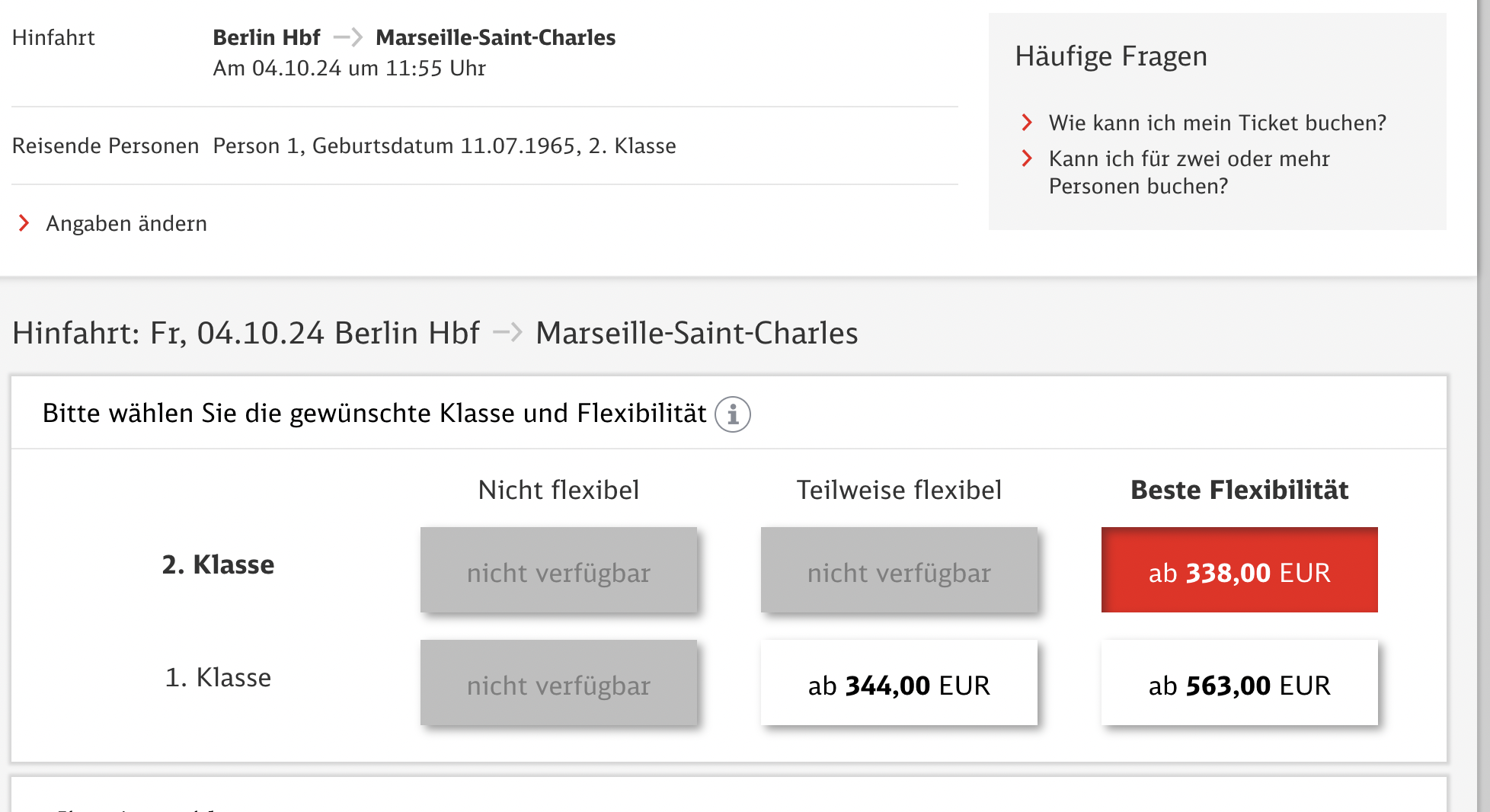 nachgesehen, bei mir dauert die fahrt 13h und kostet vielleicht mit bahncard 100€, bei mir sinds um die 380 einfach … ich müsste dann ein interrail -ticket für 10 tage buchen, für 470€ ca, das wäre dann nur knapp über doppelt so teuer wie der flug, also beides für morgen – wenn ich für in einem halben jahr buchen will, geht das leider nicht, sagt die bahn, bzw. nur das interrail-ticket, aber auch da kann mir die webseite nicht sagen, wieviel ich für frankreich und/oder bestimmte züge dazubezahlen muss, nur, dass ich es muss.