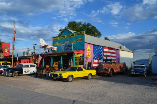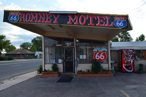 ich hatte die strecke sehr angenehm überschätzt, wir können jetzt ein paar tage lang einfach so herumgondeln, und so landen wir am nachmittag im städtchen seligman, von einem seligman gegründet im 19 jh. dann von der route 66 gelabt und genährt. mit der eröffnung der autobahn endete die geschichte, ein winziges dorf blieb stehen mit ausschließlich souvenirläden und 7 kleinen, einfachen motels, einem laden, einer kneipe (black cat, fensterlos, world famous, umgitterter hof mit paar trinkern), drei restaurants. wir bleiben im romney motel, weil ich auch mal etwas auf genau diese art heruntergekommenes haben wollte, nicht verwahrlost oder so, es benutzt einfach einen eigenen standard des in ordnung-seins, und der benötigt kein weltbügertum. es steht da seit den siebzigern, vor den zimmern ein kleiner überdachter gang mit lauter verschiedenen plastikstühlen, dann der parkplatz.